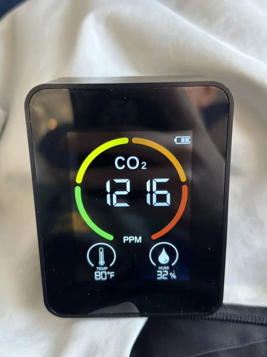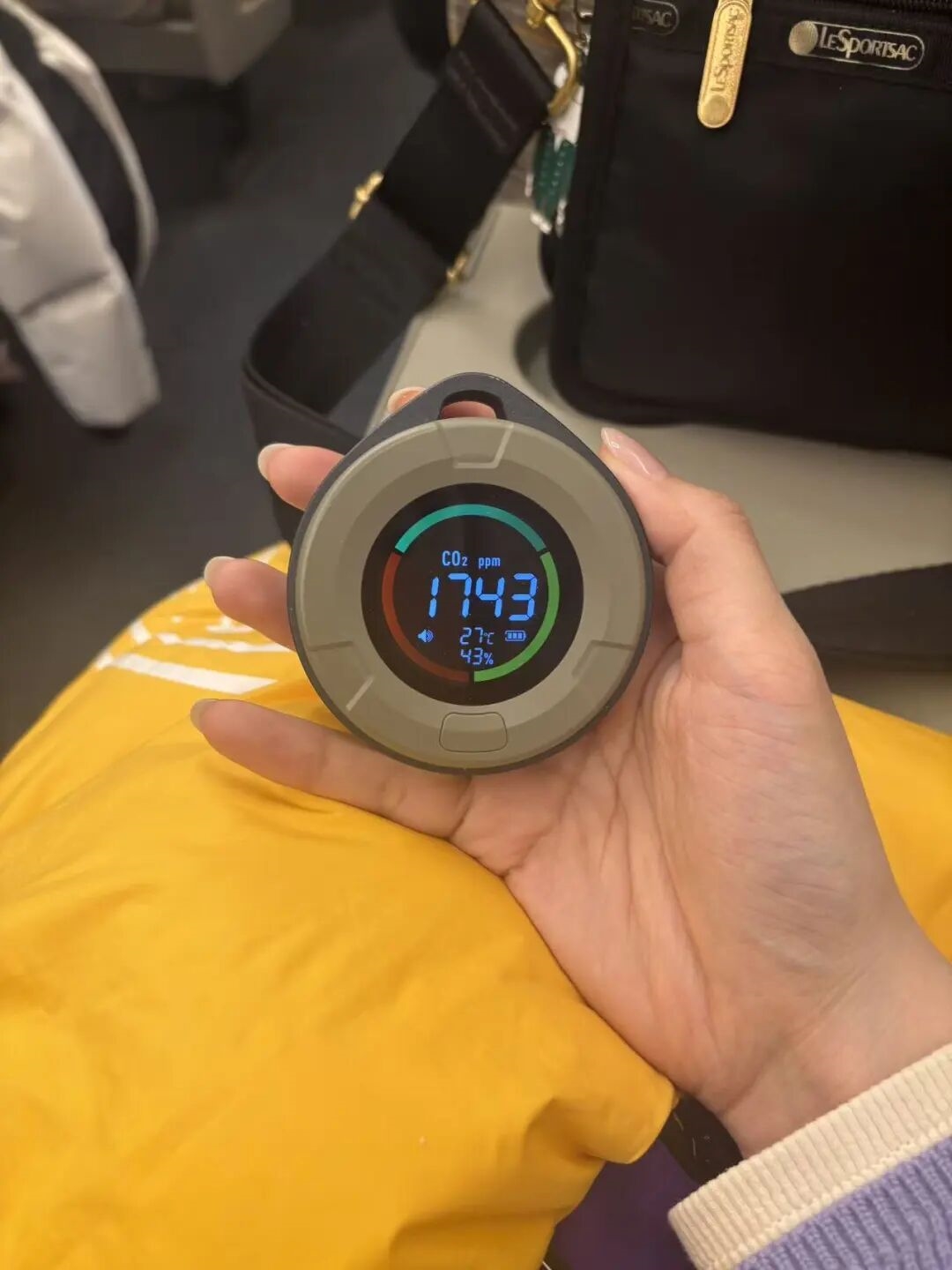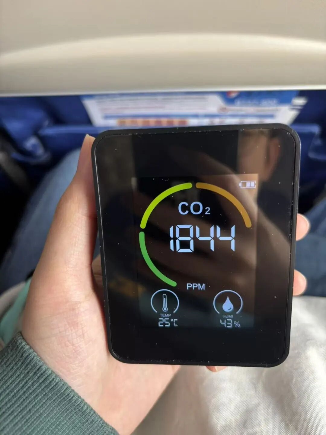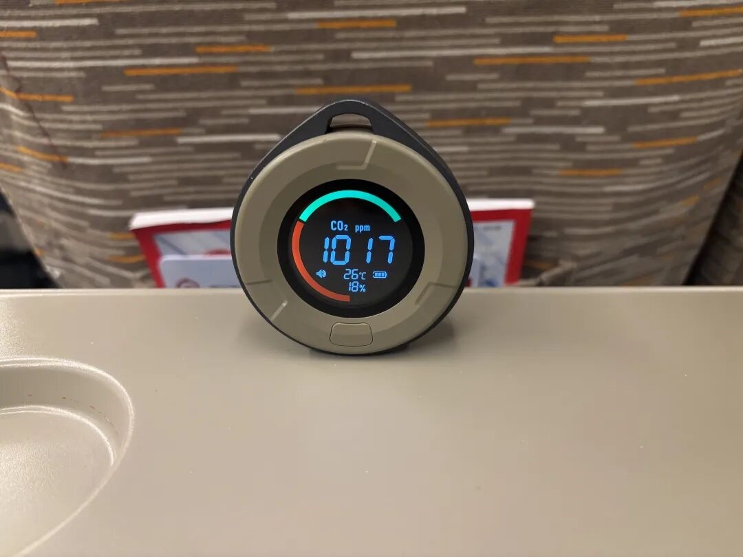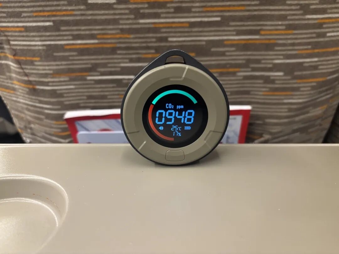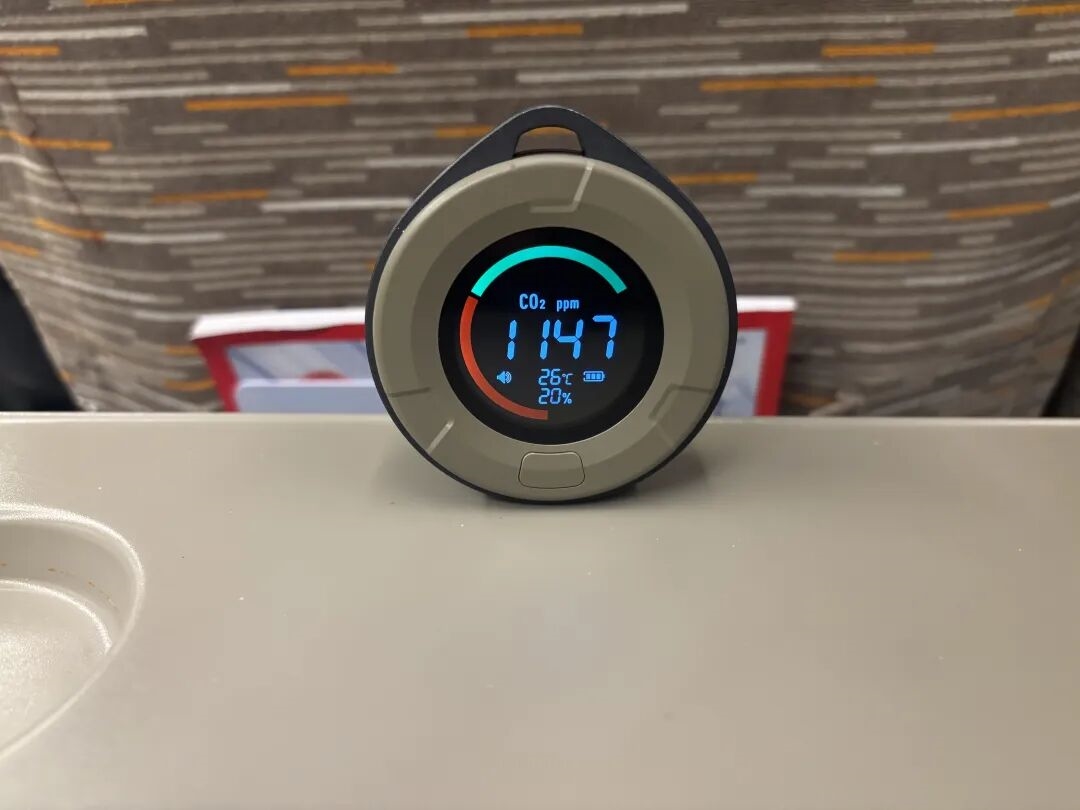 因为飞机的舱体相较高铁更拥挤、逼仄,咱们一上飞机二氧化碳浓度就遥遥领先来到了1200ppm。