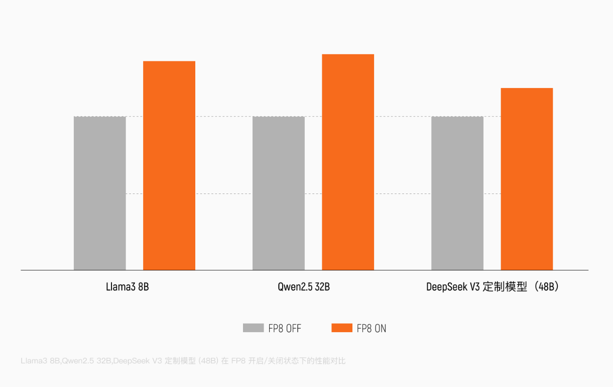 FP8相比BF16/FP16可将数据位宽减半、显存带宽压力降低50%、理论计算吞吐量翻倍,并全面支持DeepSeek、Qwen等架构,训练性能可提升30%以上。