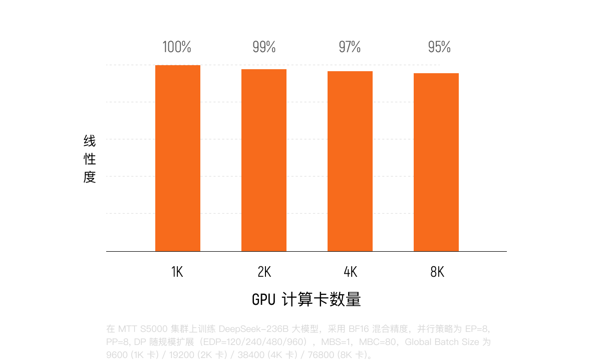 实测显示,MTT S5000从64卡扩展至1024卡,系统的线性扩展效率保持在90%以上,训练速度随算力增加几乎同步倍增。