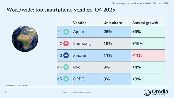 2月12日,数据机构根据Omdia最新发布的2025年第四季度全球智能手机市场数据,全球智能手机市场在该季度同比增长4%,主要得益于季节性需求回升及库存管理的改善。尽管部分厂商面临零部件成本上升的压力,但头部厂商依然主导了增长,苹果与三星继续领跑全球市场。