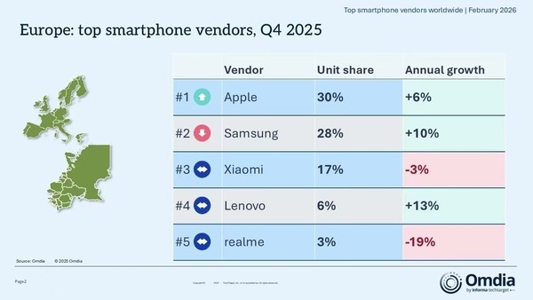 在欧洲,苹果以30%的份额超越三星(28%)登顶;三星虽然排名第二,但实现了10%的正增长;小米以17%的份额保持第三,但同比下滑3%。