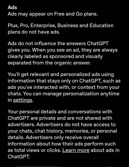 不过,OpenAI的广告计划设计得相当谨慎。根据公司发布的政策,广告将只在免费用户和每月8美元的Go套餐用户中测试,而Plus(每月20美元)、Pro(每月200美元)以及商业和企业订阅用户将不会看到广告。