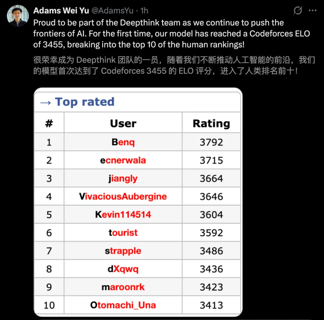 在编程界,它刷出了3455 Elo的惊人分数,达到世界冠军级的水准,冲入了Codeforces比赛人类TOP 10!