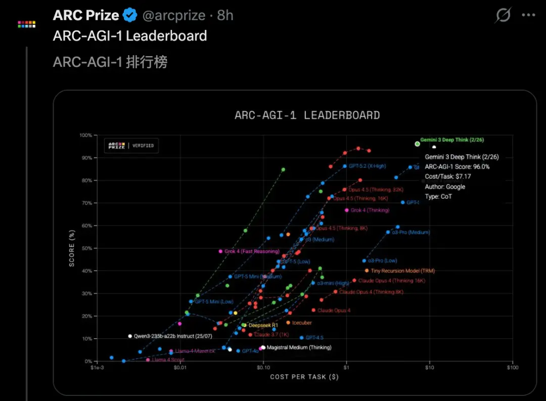 另外,Gemini 3 Deep Think在ARC-AGI-1上,直接顶到头了。
