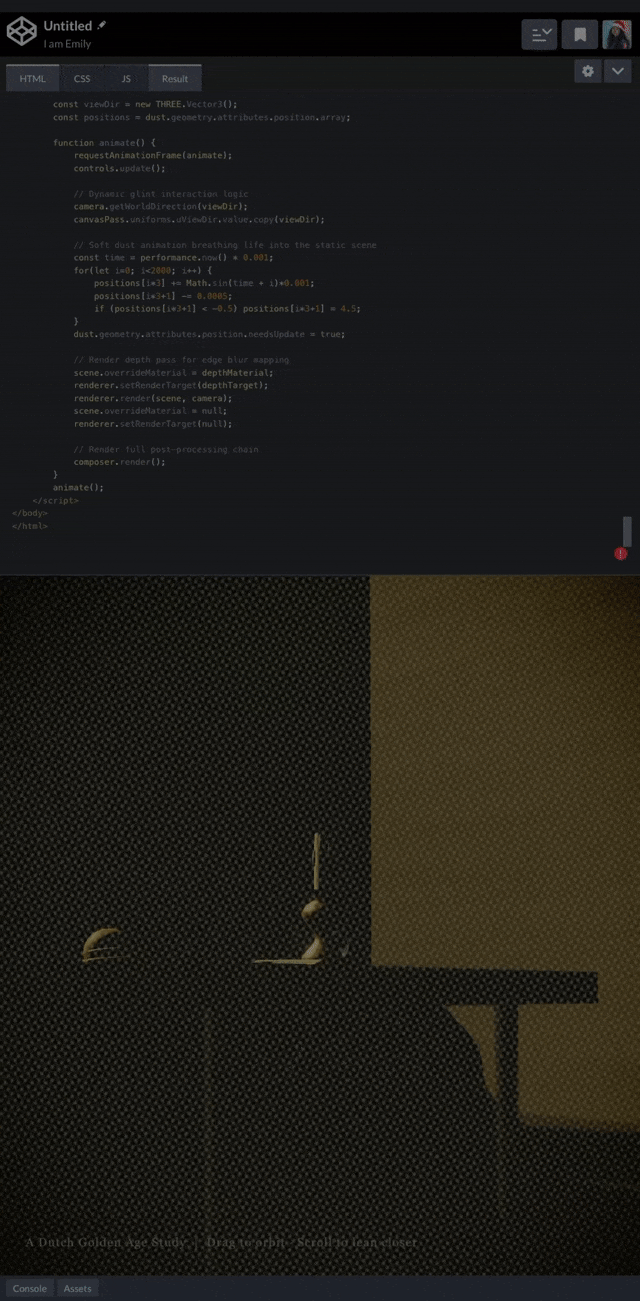 并且还可以在单个HTML文件中,构建出一个完整的Three.js场景,渲染出博物馆中古典油画难以区分的全3D室内房间。