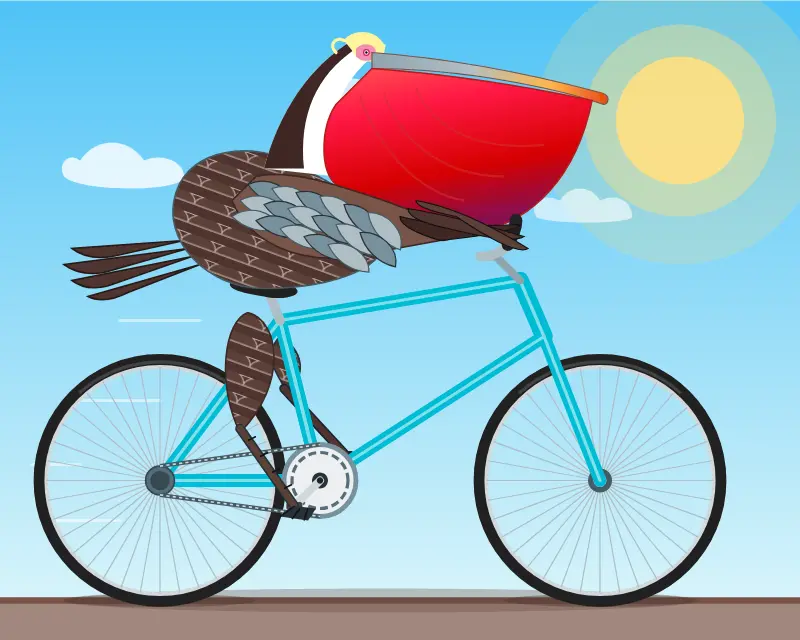生成一张加州褐鹈鹕骑自行车的SVG图像。自行车必须要有辐条,车架形状要准确。鹈鹕必须具备其标志性的大喉囊,且要有清晰的羽毛细节。必须能清楚地看出鹈鹕正在蹬车。图像需要展示加州褐鹈鹕完整的繁殖羽特征。