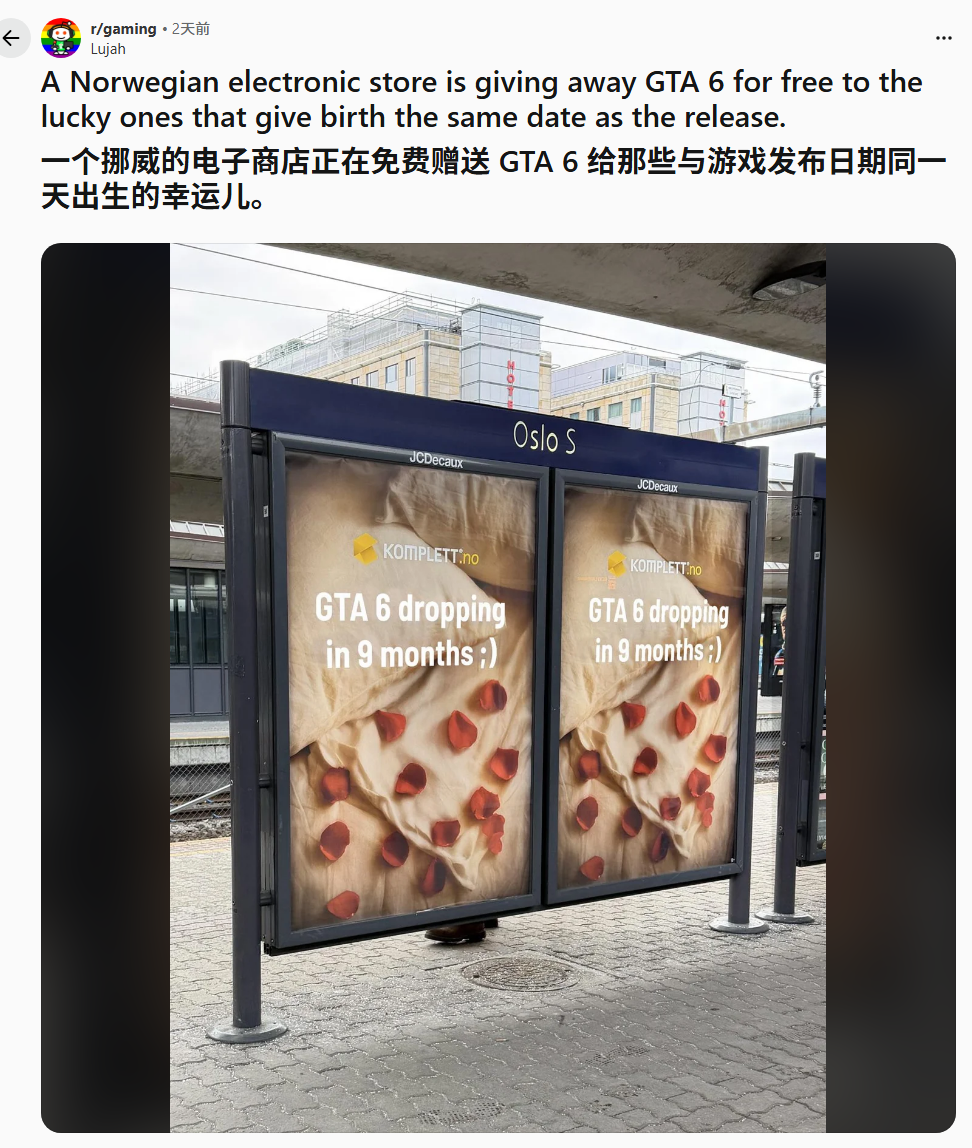 为了迎接Rockstar旗下开放世界神作《GTA6》的到来,各大零售商可谓是绞尽脑汁。近日,挪威在线零售商Komplett.no推出了一项堪称史上最离谱的营销活动,如果顾客的孩子恰好在《GTA6》发售当天出生,商家将免费赠送一套该游戏。