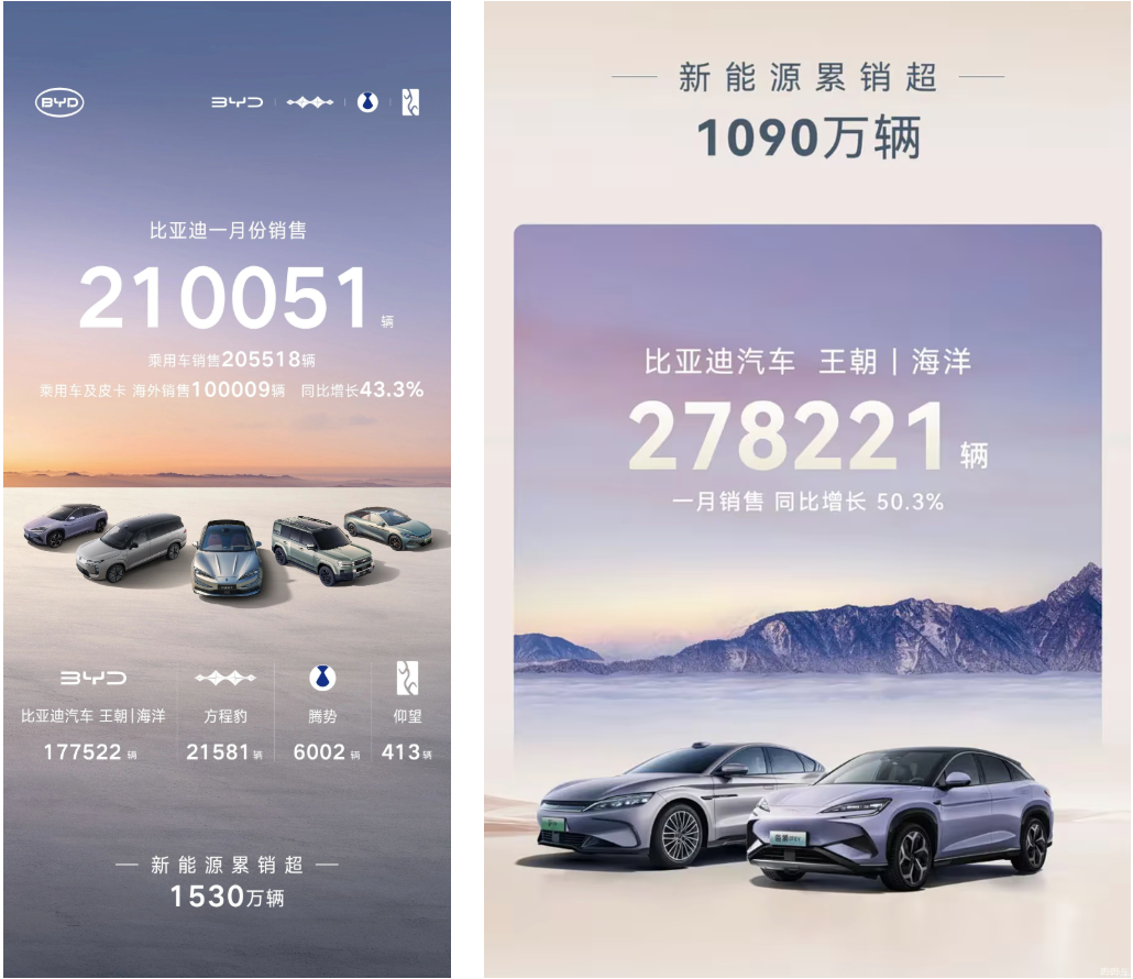 但需要指出的,比亚迪上个月出口超 10 万辆,同比增长 51.5%,出口占比几乎是全月销量的一半。此消彼长,可以简单算出今年 1 月比亚迪国内销量同比下降了52% 。而出口量的上涨对于比亚迪来说也是好事,在国内购车需求有限情况下,确实要尽快将海外市场升级为 “ 第二战场 ”。