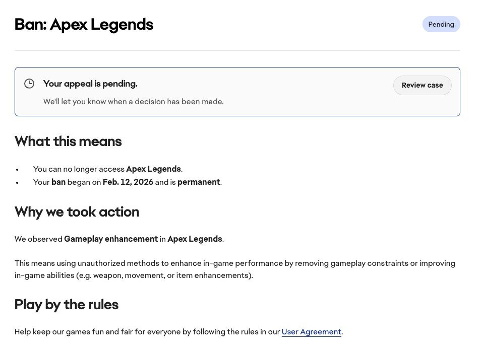 根据Iaroslav Mamalat在社交平台X上分享的一张封禁报告截图显示,一名玩家因使用"游戏增强功能"而被封号。该玩家收到的电子邮件中写道:"我们观察到:游戏增强行为。这意味着使用未经授权的方法来增强游戏内表现,包括移除游戏限制或改进游戏内能力(例如武器、移动或物品增强)"。