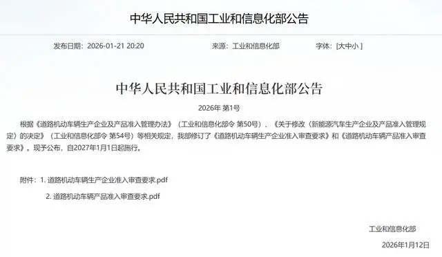 工信部发了条公告,说修订了《道路机动车辆生产企业准入审查要求》和《道路机动车辆产品准入审查要求》,从 2027 年 1 月 1 日起施行。