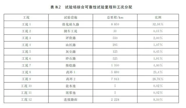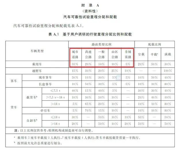 可靠性试验有个初衷是,尽可能贴近用户实际使用的场景。比如在可靠性国标里,给出了一个基于用户调研的行驶里程分配比例。拿乘用车来说,55%的使用场景是城市道路,20%是高速公路,只有 5%是非铺装路。
