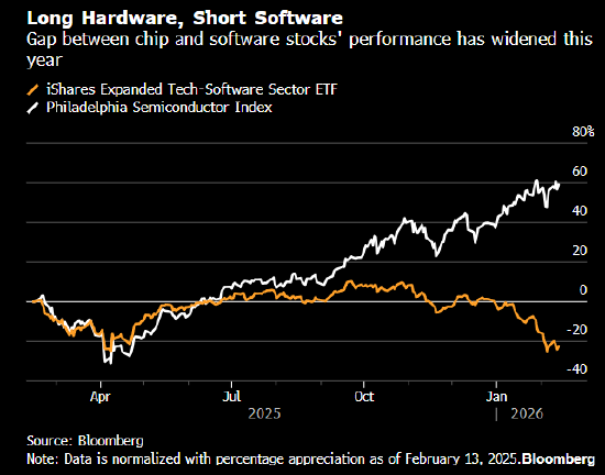 市场担忧Anthropic PBC旗下Claude Cowork等先进人工智能工具将颠覆软件行业,导致相关股票今年大幅下挫。追踪美国软件板块的交易所交易基金下跌22%,与因人工智能推动计算需求而飙升的半导体股形成鲜明对比。