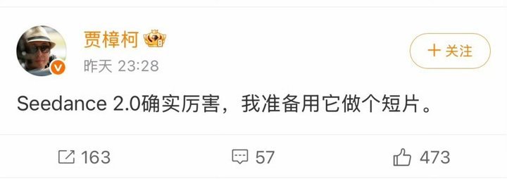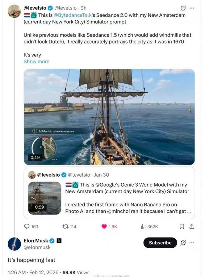 “It's happening fast(发展速度太快)”2月12日,马斯克在社交平台发出这样的感慨,他说的正是字节跳动视频模型Seedance 2.0。这一最新视频生成模型,已不再是单纯的互联网圈技术事件,而是一场席卷影视产业全链条的认知地震 。