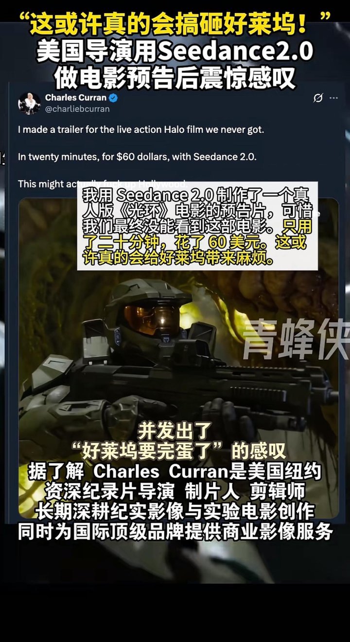 纽约资深纪录片导演Charles Curran的体验很有代表性。 他用Seedance 2.0为真人电影《光环》制作了一段预告片,整个过程仅耗时20分钟,花费60美元。这段1分24秒的视频所呈现的电影级画面特效、精准的音画同步以及专业的多机位“拍摄”效果,让这位导演发出了“这说不定真能颠覆好莱坞”的感叹。