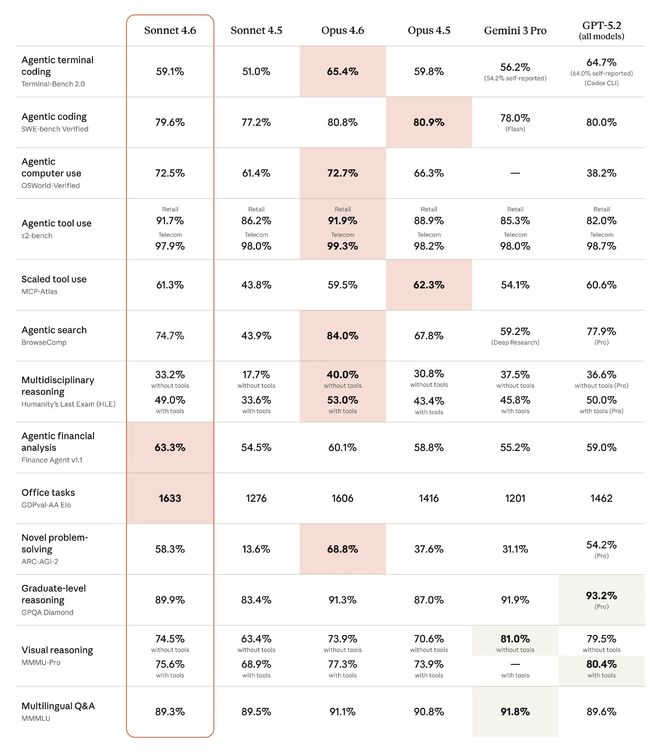 在整体的基准测试中,Claude Sonnet 4.6的表现在多个项目中表现都超过自家的Opus 4.6,以及Gemini 3 Pro、GPT-5.2。