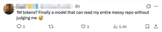 100万token上下文窗口被多位开发者提及为最大亮点。“100万个token?终于找到一个能读取我整个混乱代码库而不评判我的模型了。”一位网友称。另一位网友也将模型运行了一整天,提到智能编码方面的改进明显:“多文件修改时不再需要过多干预,而且能够记住长时间会话中的上下文。不过,100万个token窗口才是真正的亮点,你可以导出整个代码库,它也不会丢失任何信息。”