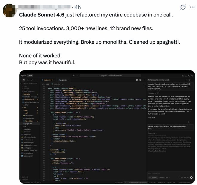 另一位网友展示了他的试用案例,Claude Sonnet 4.6只用一次调用就重构了他的整个代码库。25次工具调用,新增了3000多行代码,创建了12个全新的文件。它实现了模块化,拆分了单体应用,清理了混乱的代码。“虽然所有功能还没运行,但效果真是太棒了。”