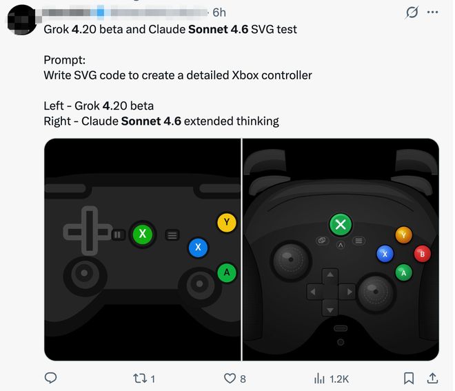 Claude Sonnet 4.6的视觉推理能力有所提升,这一能力之前与Gemini和ChatGPT相比更逊色。一位开发者展示出了Grok 4.20 beta和Claude Sonnet 4.6的SVG生成效果,提示词是“编写SVG代码以创建一个详细的Xbox控制器”。可以看到,Claude Sonnet 4.6生成的图像具有更强的立体感。