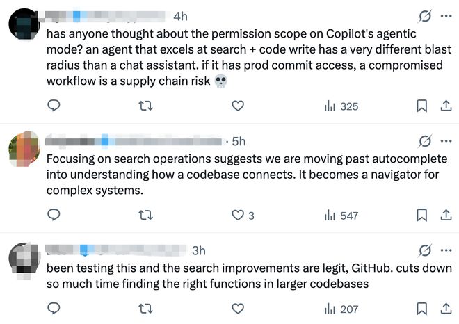 不过也有人担心Copilot Agent模式的代码安全问题。一位网友称,擅长搜索和代码编写的Agent与聊天助手的影响范围截然不同,如果它拥有生产环境提交权限,那么一旦工作流程遭到破坏,就会对供应链构成风险。