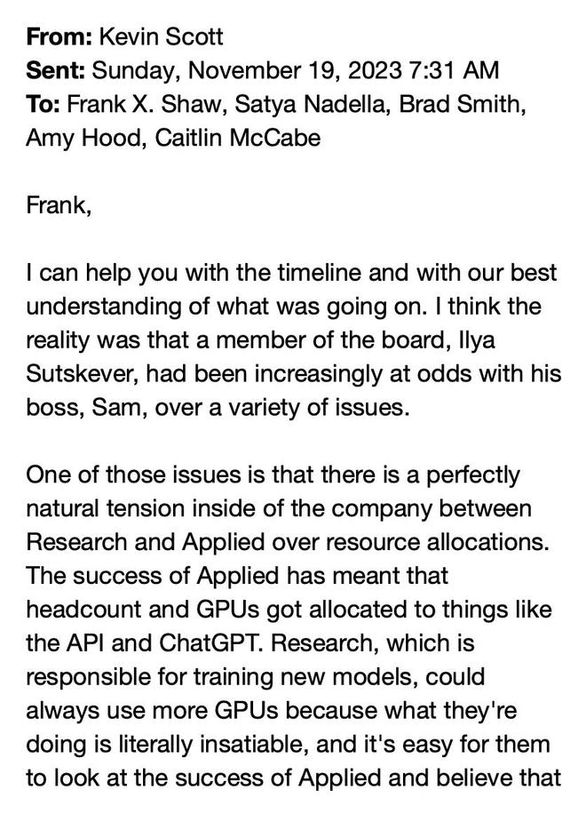 2023年11月,微软首席技术官Kevin Scott向CEO纳德拉汇报时如此剖析局势: