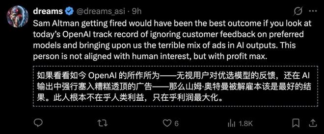 网友批评了奥特曼“与人类利益不一致,只追求利润最大化”,在AI输出中插入广告的做法,甚至表示奥特曼在2023年被短暂解雇本应该是“最佳结局”。