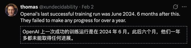 有网友暗指OpenAI在模型开发上“停滞不前”。自从2024年6月后,OpenAI在大型模型预训练上遇阻之后,一年多以来无重大突破。