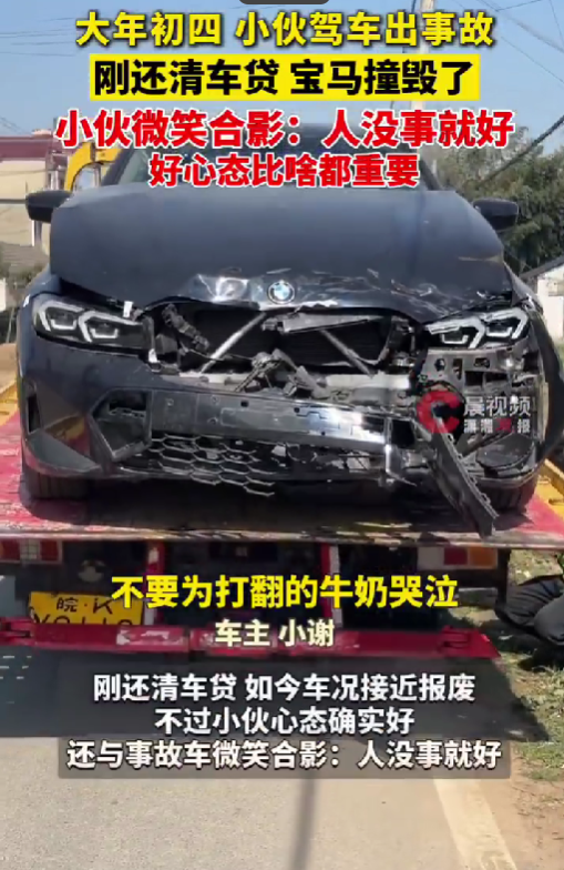 近日,安徽阜阳发生一起交通事故,一名小伙驾驶的宝马车与一辆比亚迪轿车相撞,宝马车受损严重、近乎报废。让人意外的是,这位刚还清车贷的小伙并未被负面情绪打垮,反而笑着和事故车合影,还直言“人没事就好,心态好比啥都重要”。