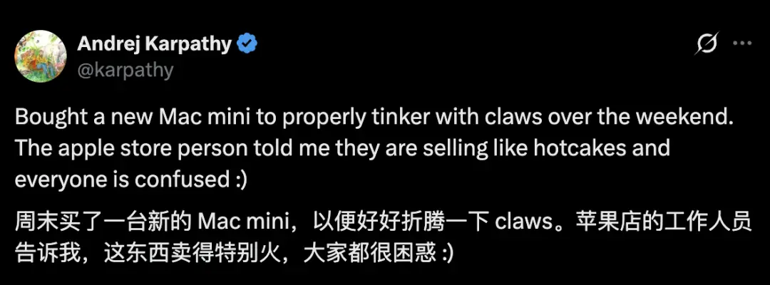 他在社交媒体上发帖:自己周末买了一台新Mac mini,准备好好折腾一番“Claws”。