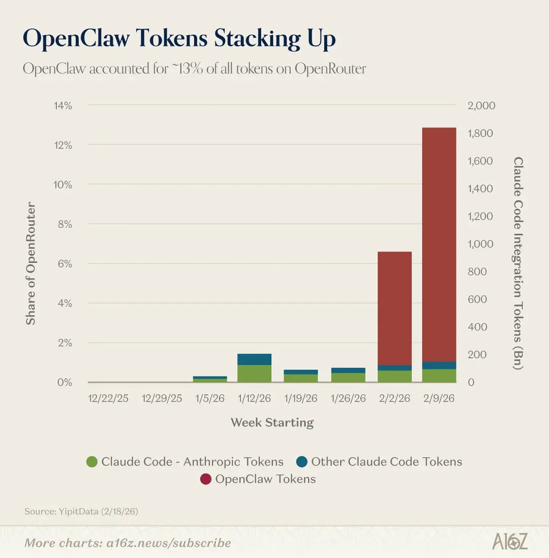 短短两周内,OpenClaw的Token使用量就飙升到了OpenRouter上全部Token约13%(主要来自开源权重模型)。