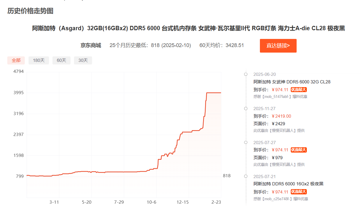 内存价格已经疯狂了小半年,预计还会持续很长一段时间,但是在欧洲,部分DDR5内存居然开始降价了。有网友一直在追踪32GB DDR5内存套装在欧洲的价格,给出了一条奇怪的曲线。