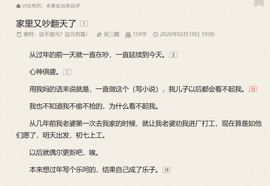 这个春节,一则消息在网文圈引发震动:起点万订作者吴三醒在回老家过年期间,被父母反复劝说放弃网文写作,最终妥协——初七进厂打工。这位曾写出《迪迦:从哥尔赞开始的无限进化》(万订徽章作品)的奥特曼同人文作者,在最新小说章节中无奈宣布:“以后就偶尔更新吧,唉。”
