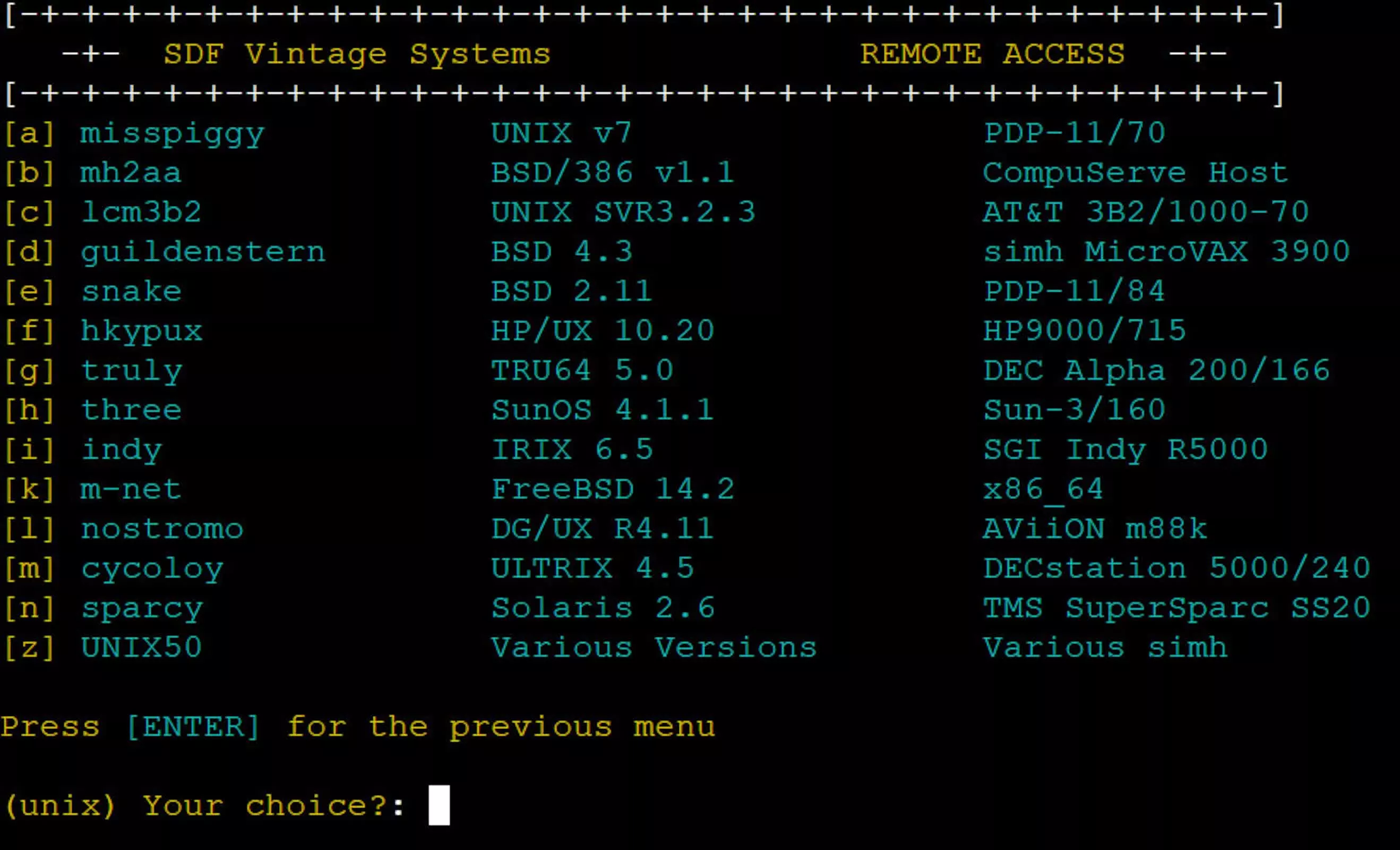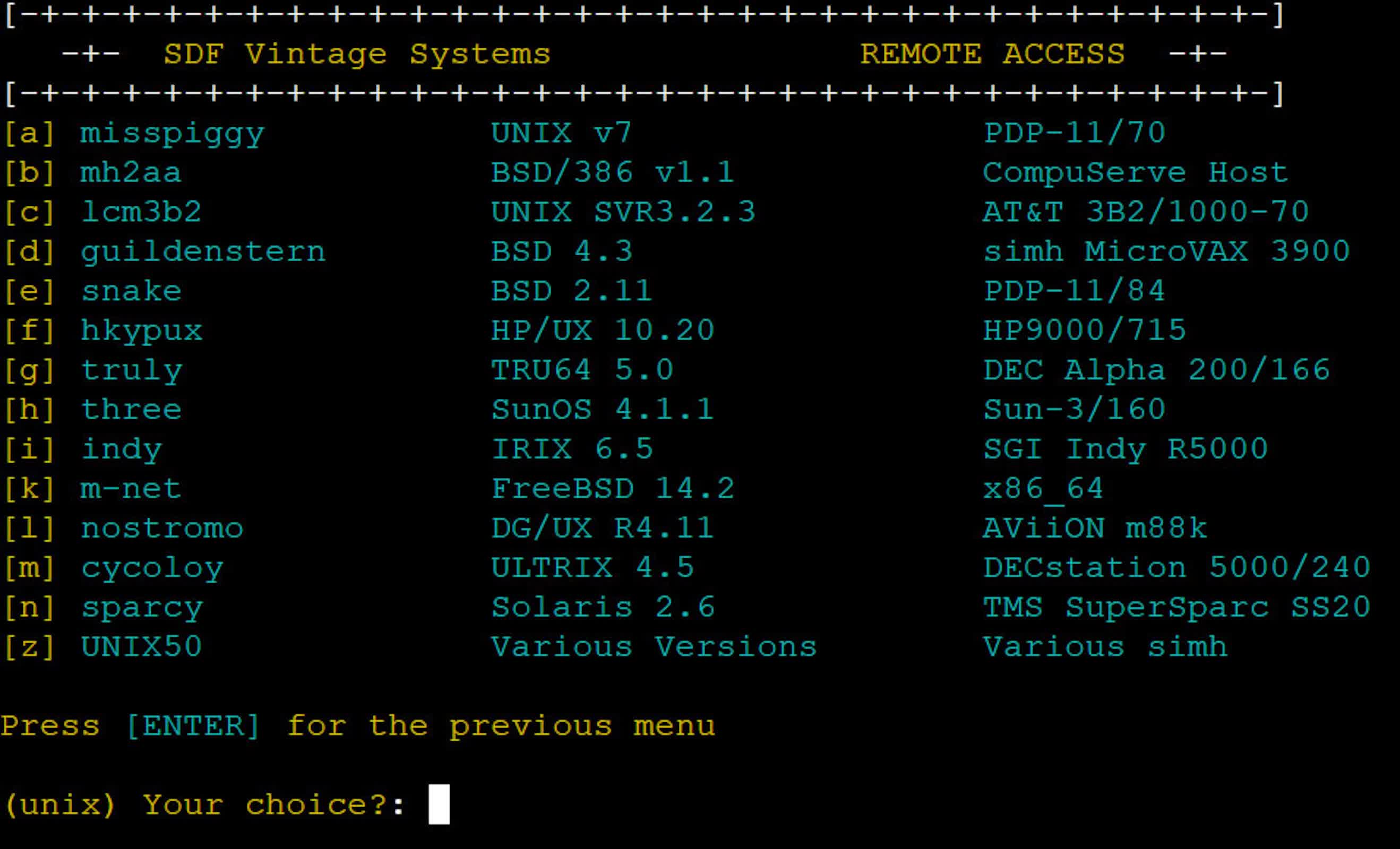 与只展示截图或静态界面的传统数字展览不同,这一项目提供的是“在线、在跑、可操作”的真实系统。访问者可通过 connect.sdf.org 登录,在文字菜单中浏览完整系统列表,进入各类历史操作系统环境。