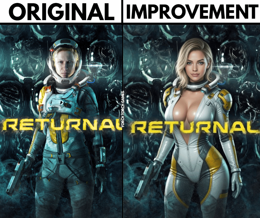 近日,博主 @YorchTorchGames 在社交媒体上发布了一张索尼 PS 旗下大作《死亡回归》(Returnal)的海报对比图,引发了玩家群体的激烈辩论。图中将原本走干练、成熟路线的女主角赛琳娜进行了“爆改”,将其形象替换为一位身材火辣、面容精致的性感女性。