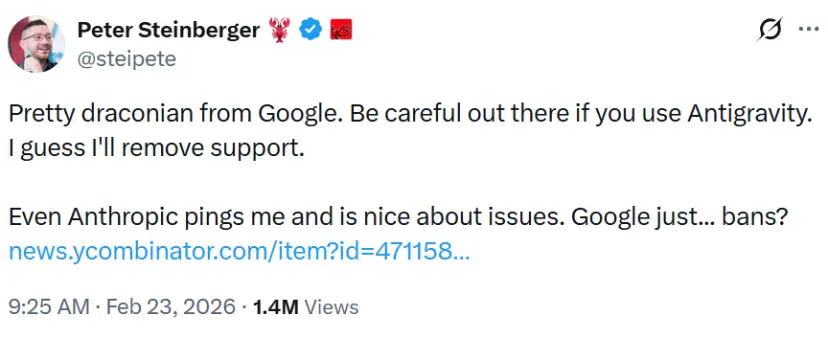 他在X上写道:“使用Antigravity的要小心了。我想我会移除对它的支持。Anthropic 至少会联系我,对问题的处理也很友好。Google呢?直接封禁。”
