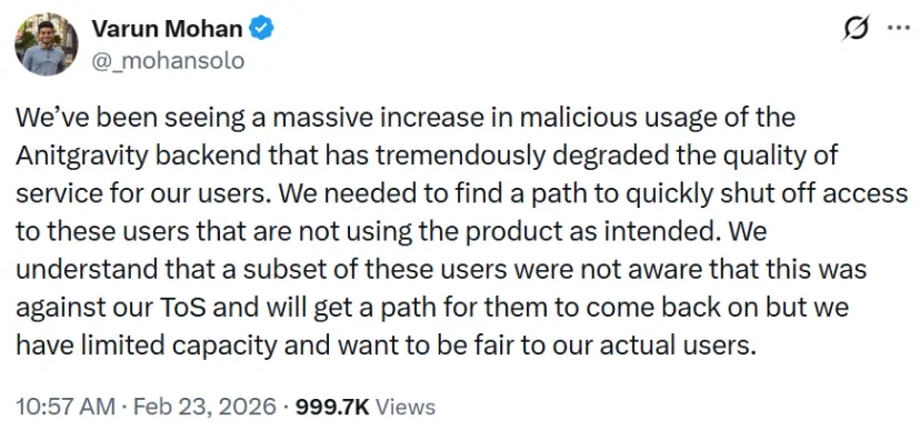 他声称,Google检测到自家AI编程工具Antigravity后端出现“大规模恶意使用行为”,严重降低了正常用户的服务质量。