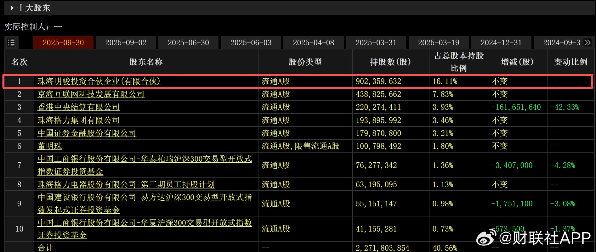 本次权益变动后,珠海明骏仍保持格力电器单一第一大股东地位。