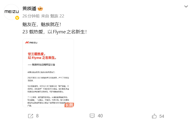今日,魅族发布战略转型公告,宣布将暂停国内手机新产品自研硬件项目,并在积极接洽第三方硬件合作伙伴,同时原有业务不受任何影响。随后,星纪魅族CEO黄质潘发文回应称:“魅友在,魅族就在!23载热爱,以Flyme之名新生!”