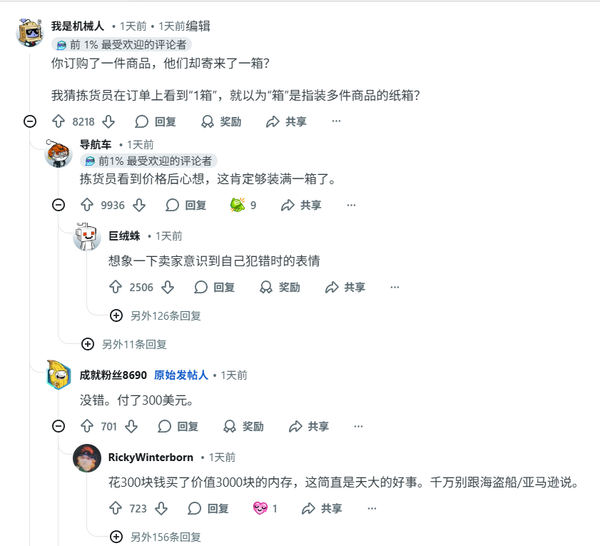 至于这场意外为何会发生,评论区里一些自称是仓库员工的网友给出了答案。这是仓库发货时的常见失误,工作人员扫描了整个包裹的条形码,而非从箱子里取出单个商品扫描,导致系统只记录了一件商品的订单,却发出了整箱货物。