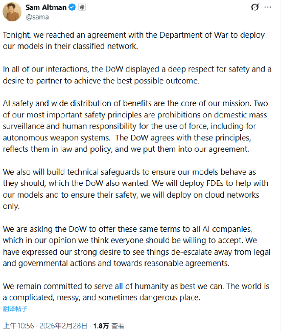 OpenAI创始人奥特曼在社媒发文称,今晚,OpenAI与“战争部”(美国防部)达成协议,将在其机密网络中部署OpenAI的模型。人工智能安全与普惠受益是OpenAI使命的核心。OpenAI最重要的两项安全原则是:禁止国内大规模监控,以及武力使用必须由人类负责,包括自主武器系统。“战争部”认同这些原则,并将其体现在法律与政策中,OpenAI也已将这些原则写入协议。