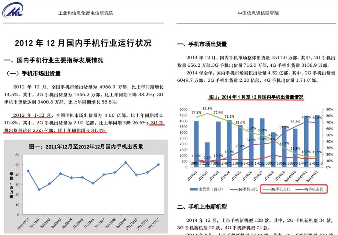 2012 年 3G 手机出货量是 2.65 亿部,比去年同期增长了 81.4%,到了 2014 年,3G 手机下滑,4G 手机销量暴涨。