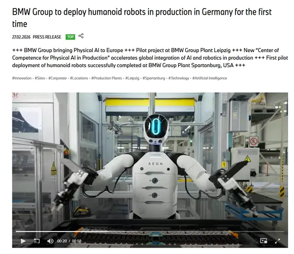 宝马集团宣布将在德国莱比锡工厂部署人形机器人,这是其首次在欧洲生产体系中引入此类具身智能技术。该项目旨在将类人机器人技术整合进现有的汽车批量生产中,并探索电池和零部件生产的进一步应用。