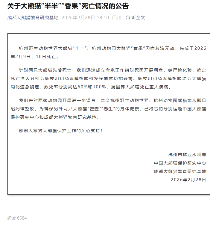 今晚,成都大熊猫繁育研究基地公众号发布了关于大熊猫“半半”“香果”死亡情况的公告。公告称,杭州野生动物世界大熊猫“半半”、杭州动物园大熊猫“香果”因病救治无效,先后于2026年2月9日、10日死亡。