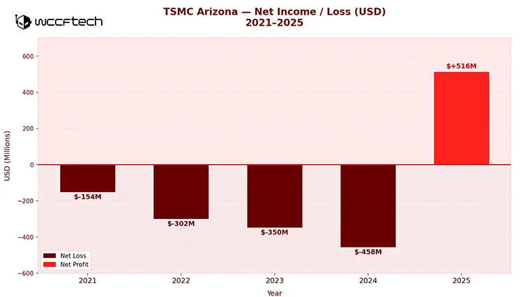在2024年,这家工厂的亏损达到4.58亿美元的历史最大值,累计亏损已达12.5亿美元。但在当年的第四季度,第一座4nm工厂“Fab 21”正式开工量产芯片,在2025年就实现了约5.16亿美元的净利润,强势扭亏为盈,并且表现优于市场预期。