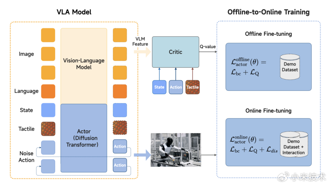 在VLA大模型Xiaomi-Robotics-0的基础上,结合强化学习技术,使机器人能够快速适配不同下游工况,并持续从真实物理环境的交互经验中学习,保障其在复杂工况下实现长时间、稳定、高可靠的作业表现。