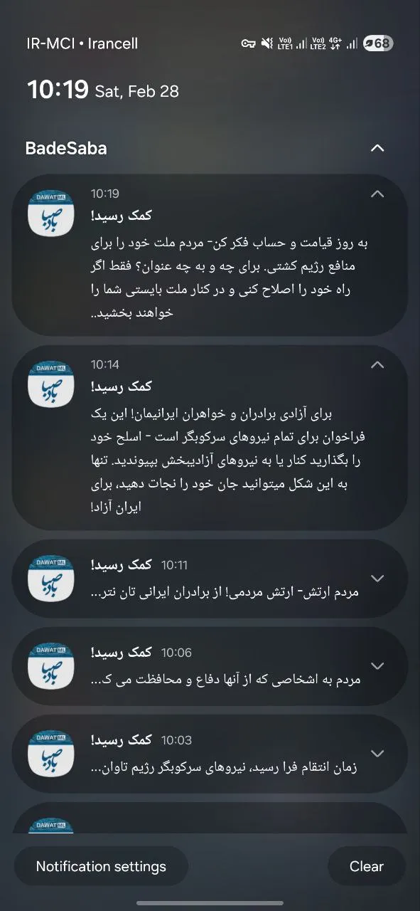 据社交媒体流传的截图显示,这些通知以“清算时刻到来”“援助已经抵达”为噱头,呼吁民众“起来反抗政府武装力量”,并承诺对参与者给予“宽恕”。其中一则信息声称,伊朗政权将为其“对伊朗无辜人民残忍而无情的行为付出代价”,显示该应用界面已被植入带有强烈反政府色彩的文字。BadeSaba 在应用商店上标称下载量超过 500 万次,但目前尚不清楚幕后黑客身份及其具体归属。