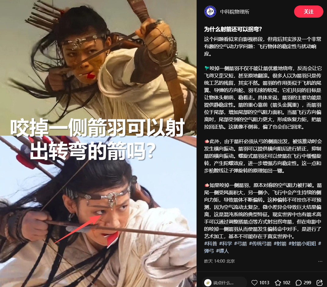 中国科学院物理研究所表示,咬掉一侧箭羽不仅不能让箭优雅地绕弯,反而会让它飞得又歪又短,甚至原地翻滚。