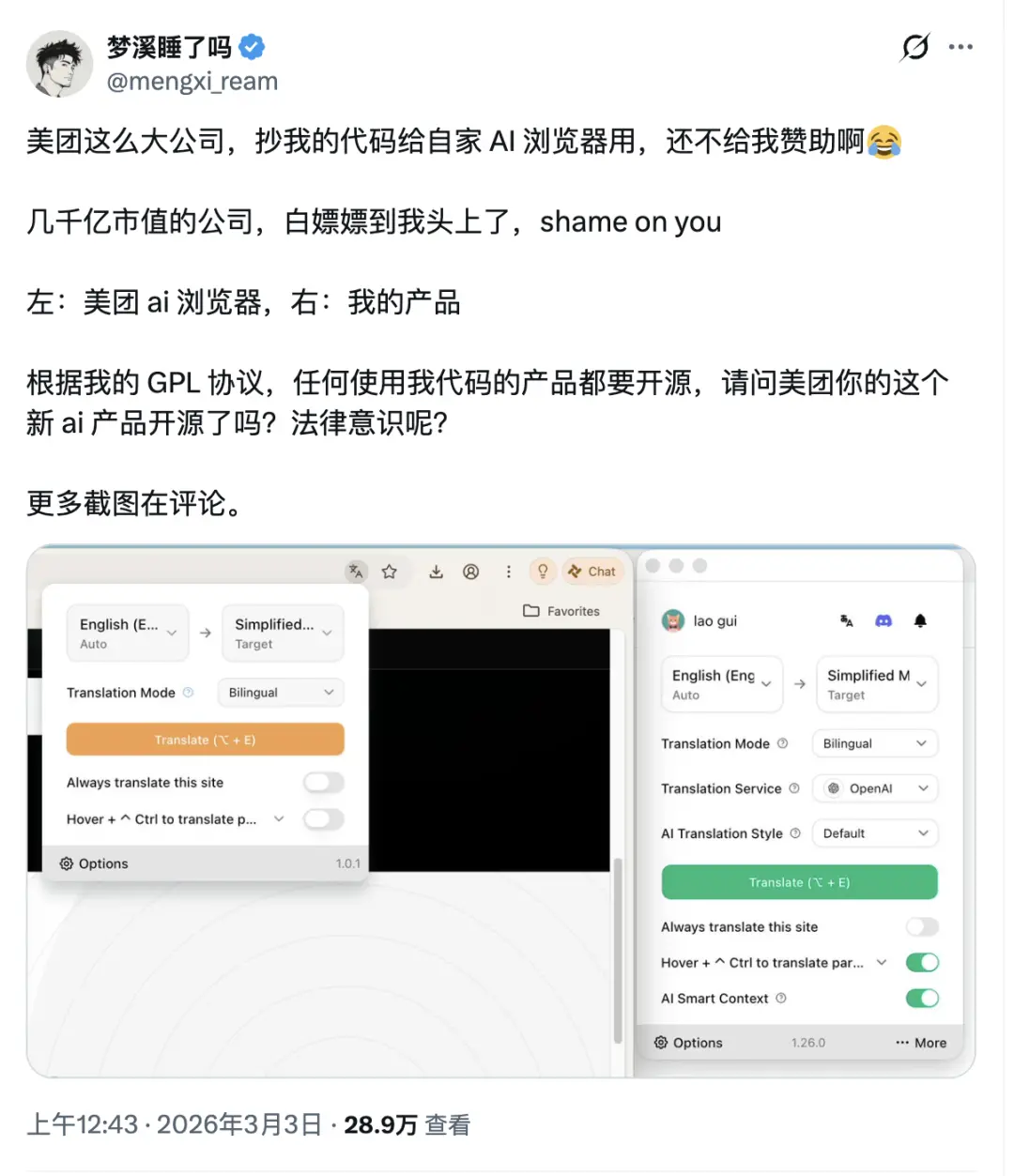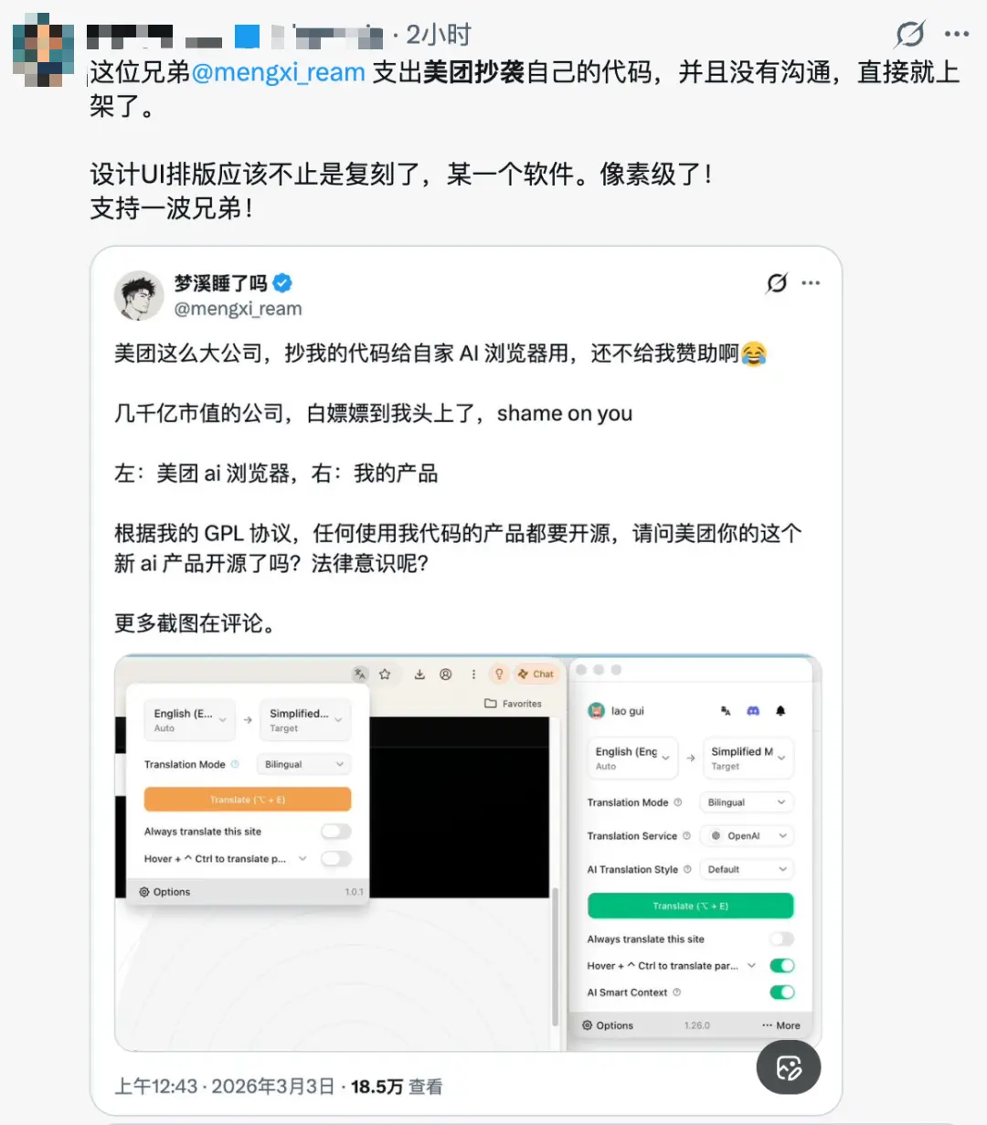 指出美团刚刚公测的 Tabbit 浏览器,在核心的翻译功能模块上,与自己的开源项目存在着惊人的相似度。