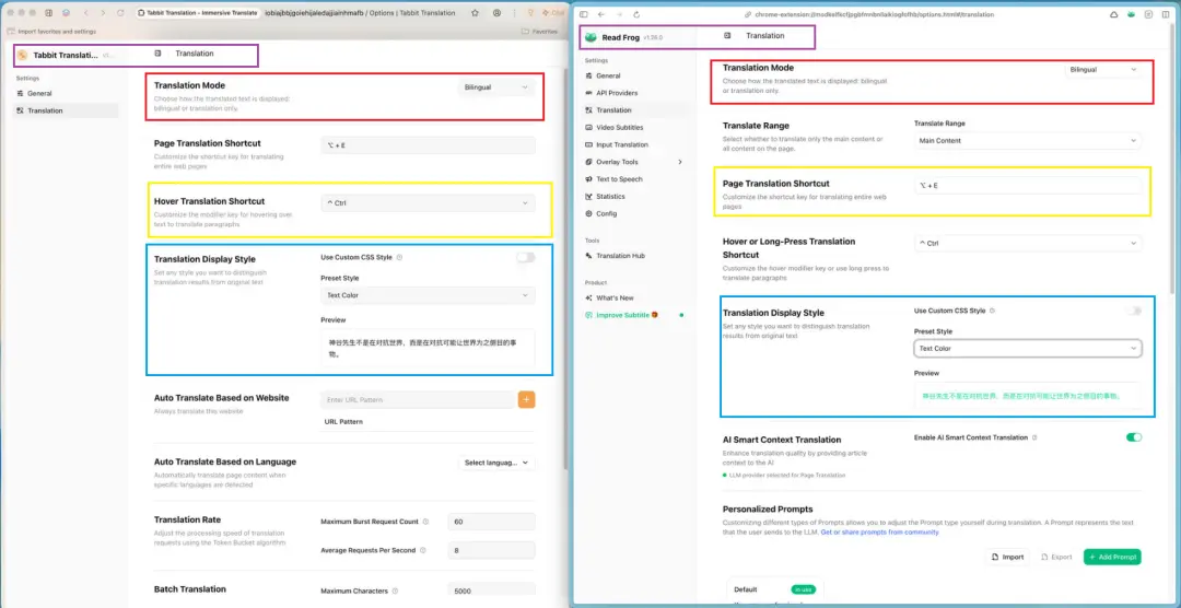 我们不妨从上往下看:在核心的翻译设置中,下拉菜单里从双语显示到只显示译文的选项逻辑与排列顺序,简直如出一辙。
