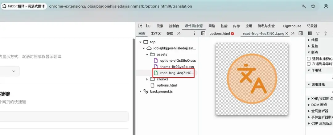 在 Tabbit 的资源文件夹(assets)深处,热心网友发现了一个并未被重命名的文件:read-frog-4eqZINCU.png。