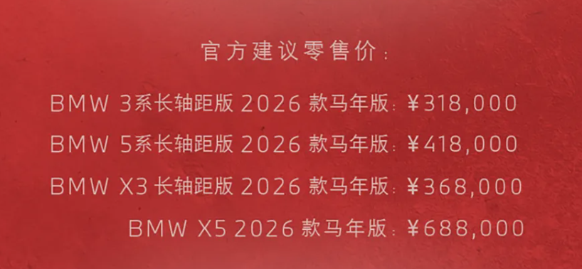 今天,宝马官方正式推出旗下3系长轴距、5系长轴距、X3长轴距及X5四款车型的2026款马年版,新车全系融入了专属中国马年的设计元素。其中3系长轴距马年版31.8万元,5系长轴距马年版41.8万元,X3长轴距马年版36.8万元,X5马年版68.8万元。